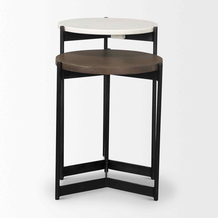 The Larkin Wooden Round Nesting Side Table Set brings a blend of elegance and modern design to any space. This set includes two tables of different heights, each with a unique top. One table features a white marble top with creamy undertones and gray veining, while the other showcases a natural brown polished mango wood top. Both tables are supported by sturdy, triangular iron frames with a matte-black finish, enhancing their stability and adding a touch of sophistication. The contrast of marble and wood creates a striking visual appeal, perfectly fitting in modern or elegant design styles.