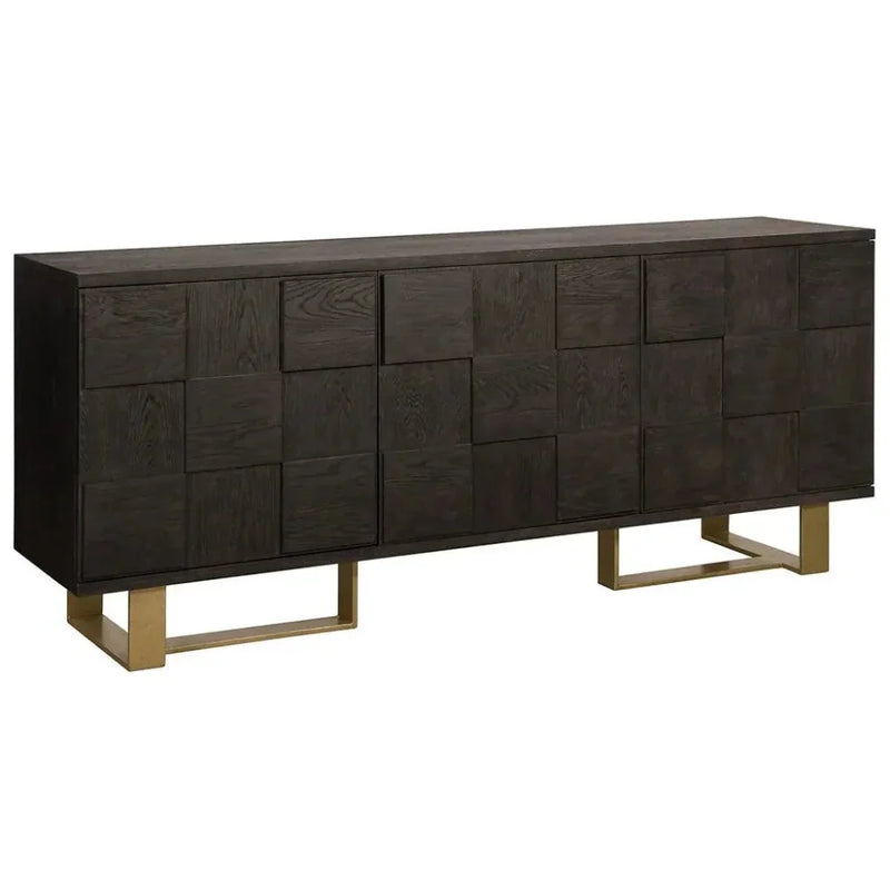 This bold sideboard will bring style and warmth to various dining and living spaces. Crafted with smoked acacia wood and an antique brass frame. Three large cabinets with three-dimensional checkered wood doors provide ample storage. Suitable for residential and contract environments. As wood is an organic, porous material, these pieces will contain natural variation of texture and may also exhibit fine indentations and cracks. Wood pieces will also display a disparity of color and grain, and visible knots and burls that add to the character of each piece.