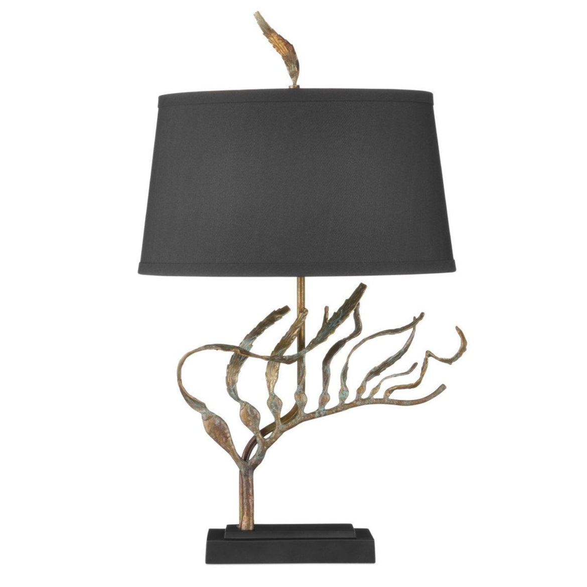 The Latissima Table Lamp brings a touch of the ocean into your home with its unique design. Crafted with a sculptural brass form, the lamp's fluid metal extensions resemble graceful kelp swaying under the sea. Resting on a sturdy black metal base, it adds a hint of nature's elegance to any room. The verdigris patina finish highlights the artisan craftsmanship, making each lamp a unique piece of art that stands out in any decor setting.