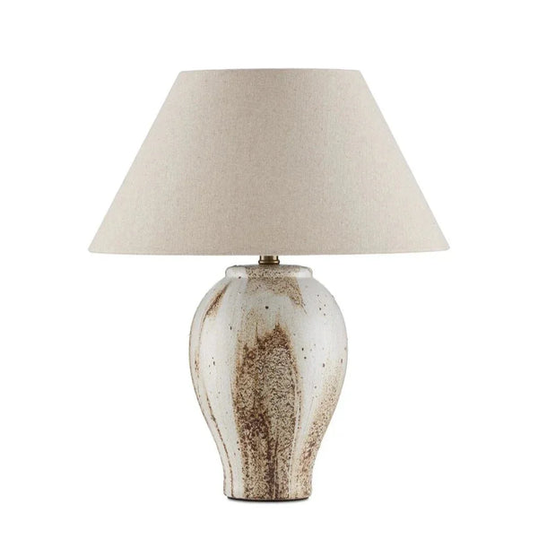 The Latte Beige Table Lamp adds a touch of modern elegance to any room. Made from high-quality ceramic, it features a unique blend of beige, off-white, and brown colors that mimic the appearance of cream swirling into coffee. With its textured finish, this lamp brings an artisanal feel to your space. Each piece is unique due to the glazing process, making it a special addition to your home decor. The beige empire shade enhances the warm tan tones when the lamp is on, creating a cozy atmosphere in your living space.