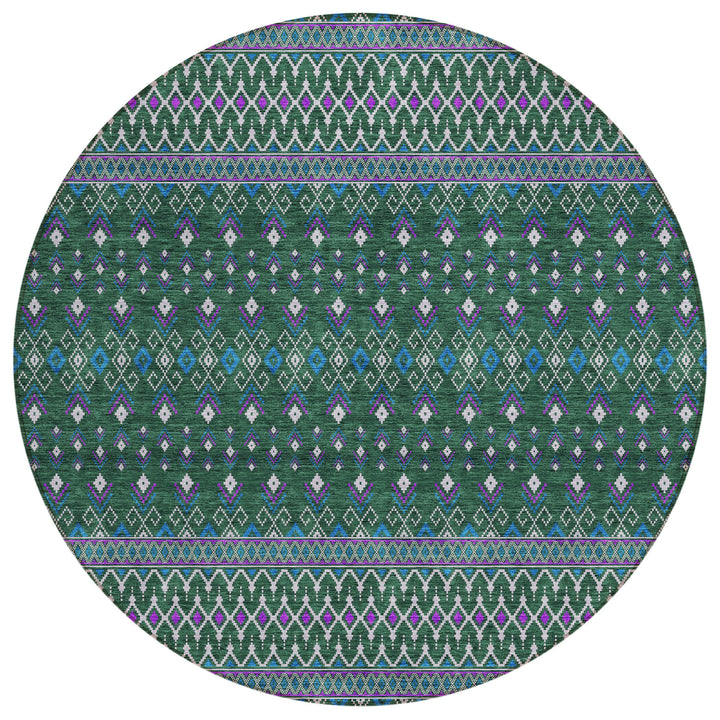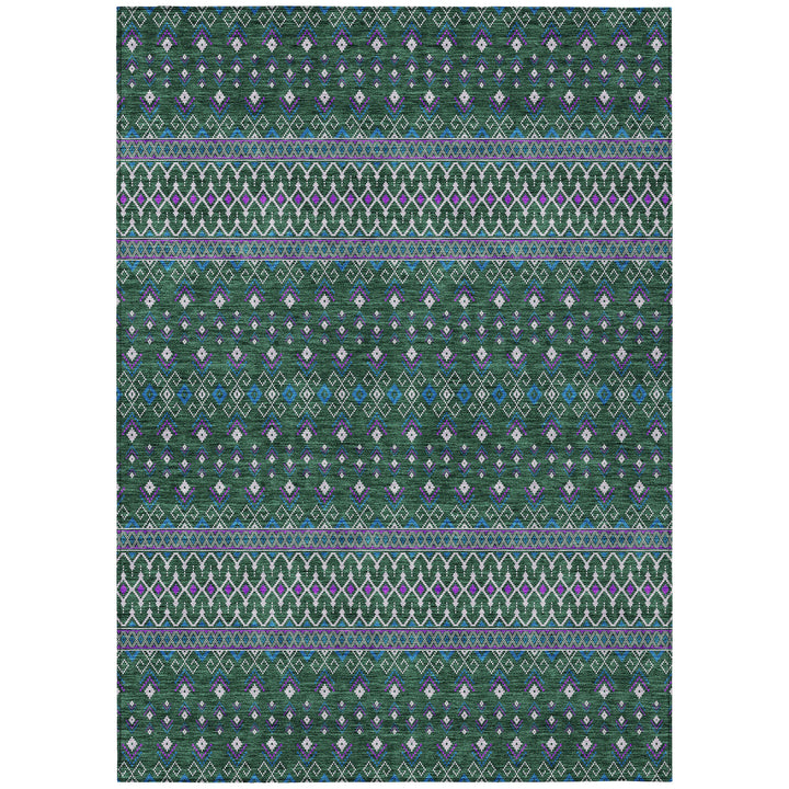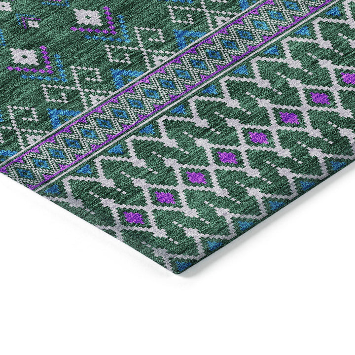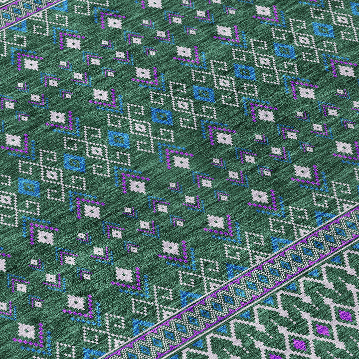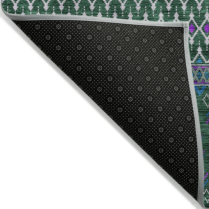 Embrace the charm of boho chic with this elegant green rug, adorned with delicate diamond patterns. Its transitional style blends bohemian flair with subtle elegance, making it a versatile addition to any space. Designed for both indoor and outdoor use, this rug features UV protection to withstand sun exposure, and its ultra-thin profile allows for quick drying after rain. The non-slip backing ensures safety, while the machine-washable polyester fabric offers convenience for busy homes with pets and kids. Whether under a living room chandelier or on a sunny patio, this rug elevates any setting with style and functionality.