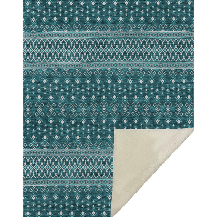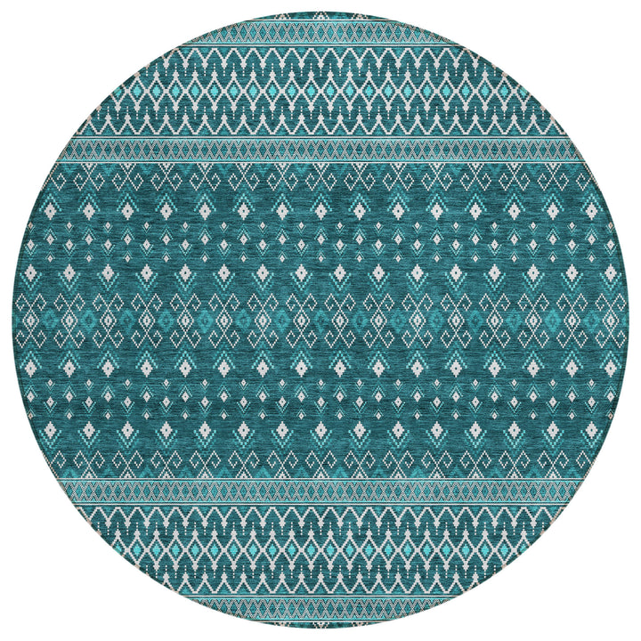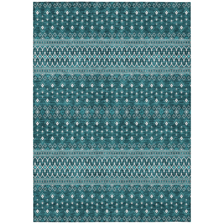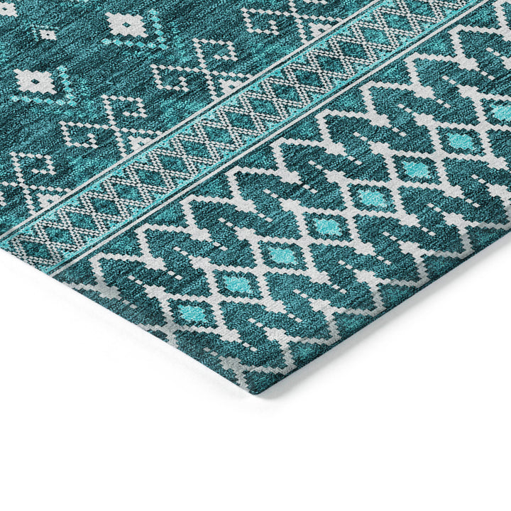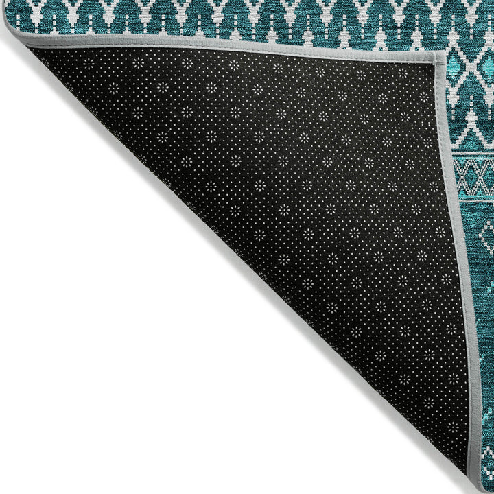 Step into the boho chic style with this beautiful teal rug. Its delicate diamonds add a touch of elegance, making it a perfect match for both indoor and outdoor spaces. With UV protection, it stays vibrant under the sun or beneath your living room lights. The ultra-thin design ensures quick drying, and its non-slip backing adds safety. Made from 100% polyester, it is machine washable, making it ideal for busy homes with kids and pets. This rug offers a blend of style and practicality, creating a welcoming space wherever it’s placed.