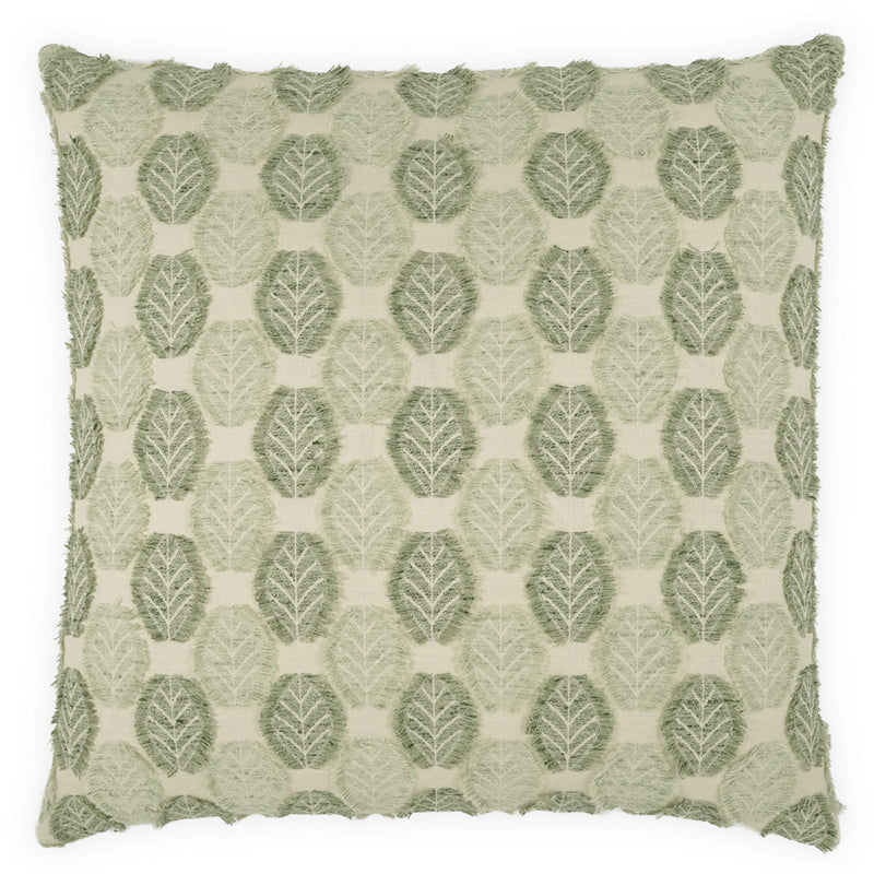 The Leafalong Pillow is a beautiful addition to any home. Crafted with care in California, this pillow showcases a lovely floral design with shades of green on the front and a soft ivory color on the back. The fabric is a blend of 43% cotton and 57% polyester, making it both soft and durable. The pillow's insert is filled with 95% feather and 5% down, providing a plush feel. The cover is removable with a hidden zipper, making it easy to clean. This pillow adds a touch of elegance and comfort to any room, with its unique leaf pattern and frayed edges.