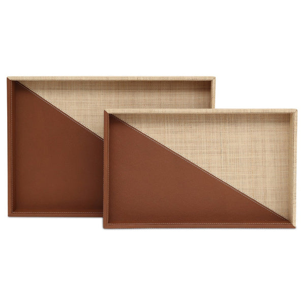 The Leather & Raffia Tray Set includes two decorative trays with a clean, tailored aesthetic. Camel-colored leather is combined with panels of finely woven raffia, each stitched to the wood frame in a diagonal pattern. The mix of textures and precise detailing gives the trays a refined, classic appeal. This set is not meant for serving food and drinks as the materials are not spill-proof. Due to the artisanal material, the surface of each accessory could differ slightly.