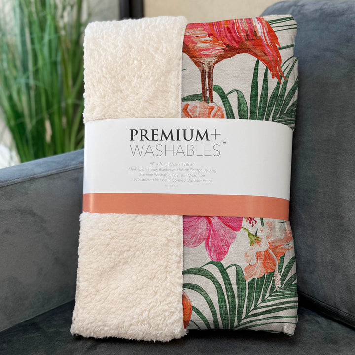 Immerse yourself in a tropical escape adorned with whimsical flamingos and lush palms, perfectly capturing an island vibe. The oversized 50" x 70" dimensions make it a generous haven of comfort, featuring a luxuriously soft-touch front and a cozy sherpa backing. Crafted from fade-resistant polyester microfiber, it's perfectly suited for both indoor and even covered outdoor retreats, ensuring longevity and easy maintenance with its machine-washable convenience.