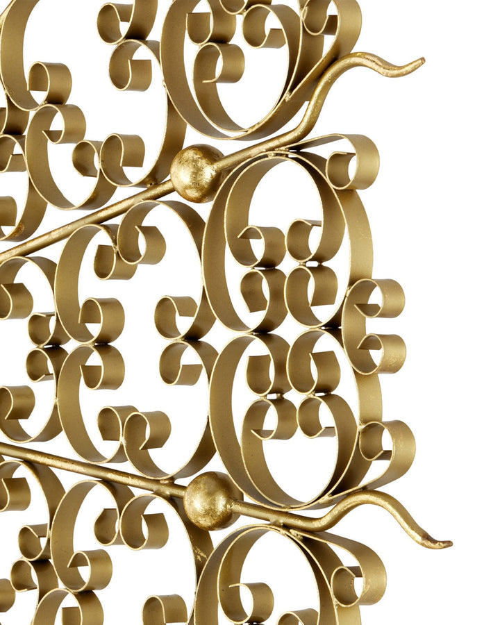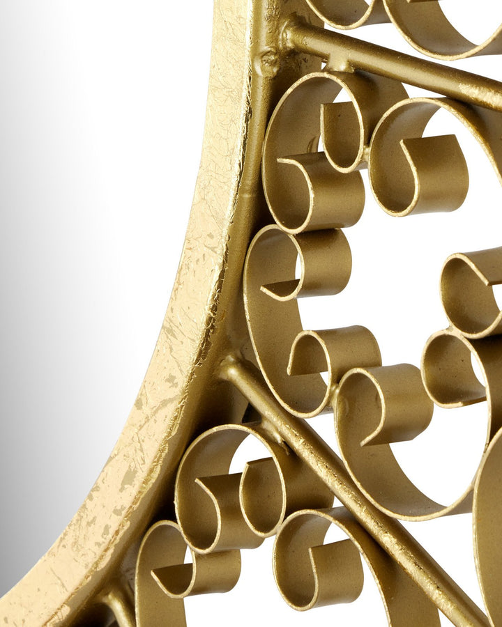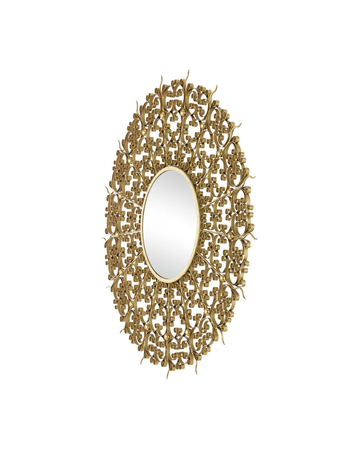The Levain Round Mirror brings a classic and elegant touch to any room. Its design features a convex mirror at the center, surrounded by detailed ornamental scrollwork. This scrollwork is reminiscent of vintage gates and ornate screens, adding a unique charm to the piece. The swirling metal design extends in a sunburst shape, making this mirror a focal point in any setting. The gold leaf finish provides a warm and sophisticated glow, enhancing the overall aesthetic of the room.