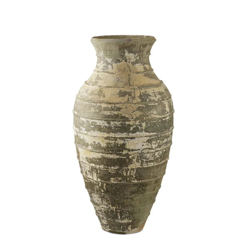 Crafted from terracotta and finished in an aged white glaze, the urn features intentional pitting and surface variations to evoke the character of a well-worn antique. This weathered effect gives the impression that the piece has stood quietly in the elements for decades. Whether used to display greenery or left unplanted as a sculptural element, the Lipari Urn offers old-world beauty and enduring style for any setting.