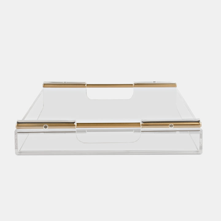 The Livia Tray is a perfect mix of modern style and simple charm. Made from clear acrylic, it looks sleek and fits well in any setting. Its soft, rounded edges play with light, adding a touch of depth and brightness to your space. The antique brass detailing brings warmth, making it a classy piece that blends modern and classic styles. This tray is not just for looks; it's practical and ready for everyday use. Whether you’re serving snacks or displaying decor, the Livia Tray adds a stylish touch to any room.