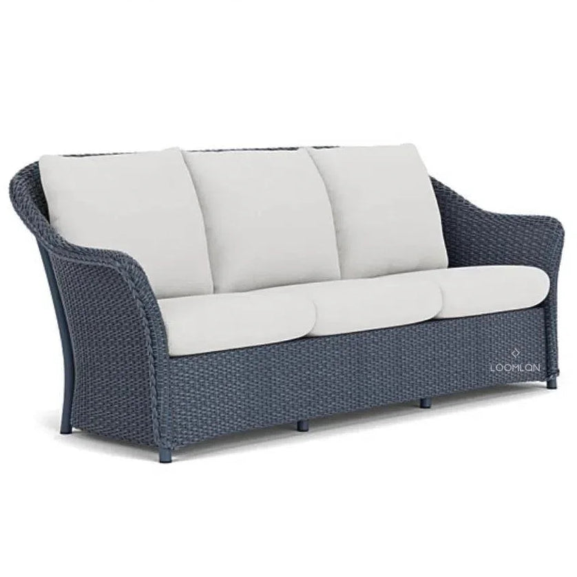 This plantation-style outdoor 3 SEATER SOFA from the Lloyd Loom collection is showing in Denim Blue Finish and Canvas Natural all-weather fabric. This made-in-America outdoor furniture comes with a satisfaction guaranteed promise and a favorable long-term warranty. Make your own patio furniture with 20 rust-resistant wicker finishes and an extensive selection of fade-resistant, mildew-resistant, and water-repellent fabrics. Featuring exceptional seating comfort and resilience, inherently mildew/bacteria resistant components, and the security of knowing that Comfort Plush Premium Outdoor Seating System is an environmentally friendly product.