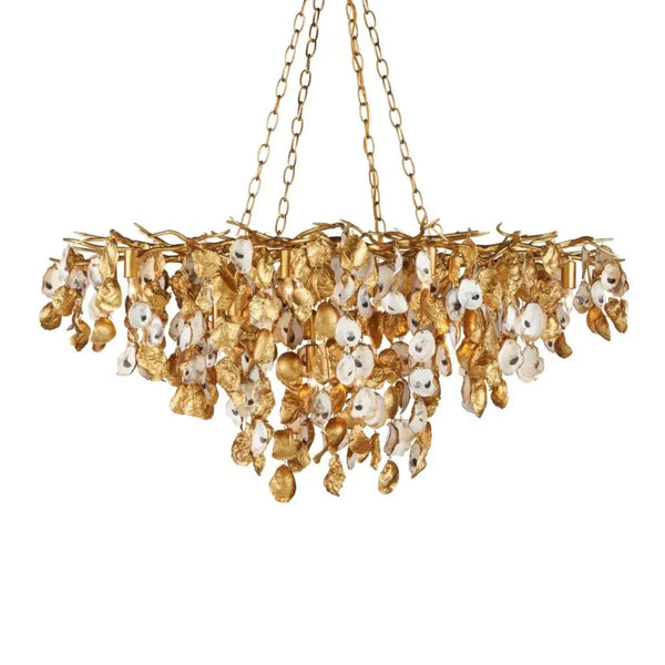 This extraordinary fixture showcases genuine oyster shells leafed in contemporary gold, creating a piece where natural ocean materials meet luxury metalwork. Each oyster shell is individually selected and hand-applied with gold leaf, ensuring no two chandeliers are identical. The oval form swells outward from a central axis, creating visual drama that draws the eye upward while distributing light evenly across expansive spaces. At 43.5 inches wide and 29 inches deep, this Currey & Company chandelier establishes itself as the focal point in any room it illuminates.