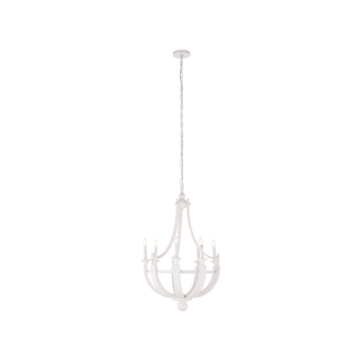 The Lumiere Blanche 8-Bulb White Chandelier Elegance blends classic charm with modern style. Its graceful design features a clean white finish, offering timeless appeal. With eight bulbs, it provides a warm and inviting glow, adding sophistication to any room. The chandelier's metal construction ensures durability, while the curved arms and candle-style lights enhance its elegant look. Perfect for contemporary spaces, it comes with a 6-foot chain for easy installation. This chandelier is an ideal choice for those seeking to add a touch of elegance and brightness to their home.