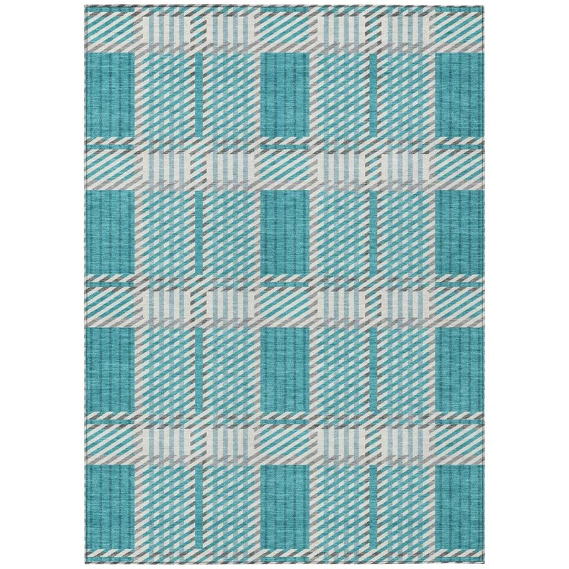 The rug's ultra-thin construction and non-skid backing offer practicality and safety, making it ideal for high-traffic areas. Whether placed in a living room, hallway, or outside on a patio, this rug dries quickly after rain or cleaning, thanks to its fast-drying profile. Available in multiple sizes, you can find the perfect fit for any space. The teal color adds a refreshing splash of color, while the plaid pattern brings timeless charm. Its stain-resistant properties further enhance its practicality, making it a reliable choice for any household.