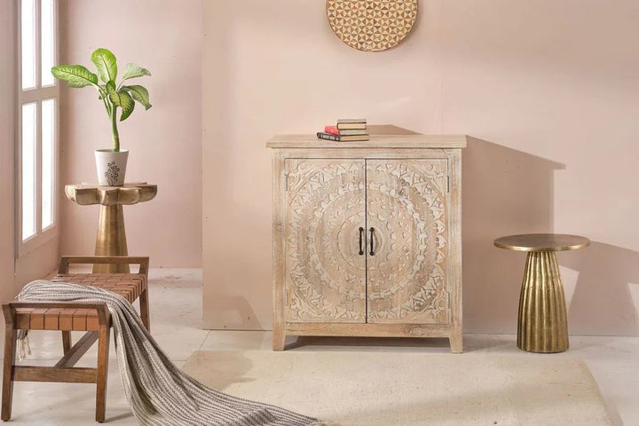 Lyan Two Door Wood Cabinet With Intricate Carvings Features:
