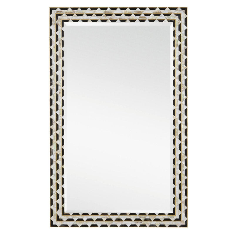 The Macy Rectangular Mirror has an intricate frame made of a sophisticated mix of materials that includes mother of pearl, horn, and brass. Not only does the shell on the black and white mirror shimmer, the black pieces of horn and the brass edging do as well. This is an artisanal offering, as every piece of material is hand-cut and hand-applied.