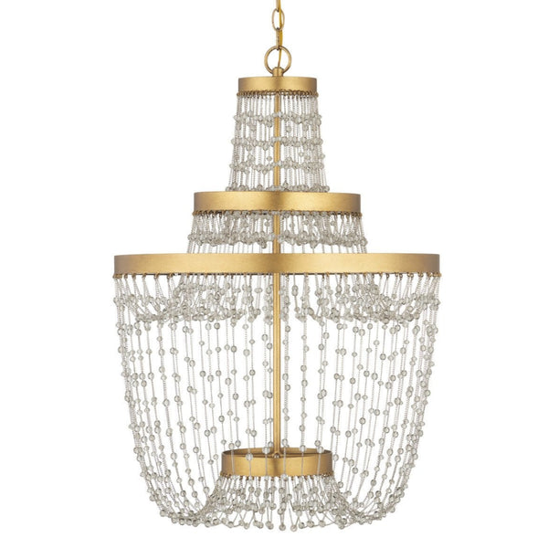 The Mademoiselle Medium Chandelier offers a touch of elegance to any room with its flowing swags of glass beads and wrought iron bands. This chandelier is finished in a contemporary gold leaf, adding a warm and inviting glow to your space. The loose, free-form arrangement of beads gives it a unique, sculptural quality that stands out as a centerpiece. With integrated LED strips discreetly hidden, the chandelier provides an ambient glow that enhances the shimmer of the beads and the rich tone of the gold. This combination of materials and design elements creates a striking balance between modern and classic aesthetics.
