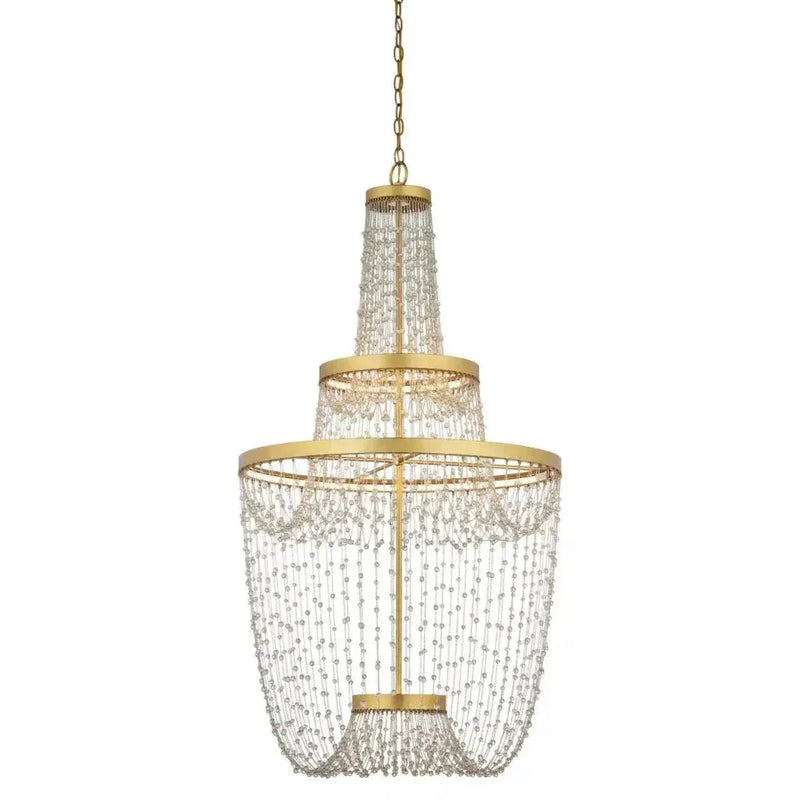 Crafted with glass beads and wrought iron, the Mademoiselle Chandelier is both sturdy and stylish. Its contemporary style fits seamlessly into modern decor, while the polished gold finish adds a touch of classic charm. The chandelier is adjustable, with a drop length ranging from 61.5 inches to 129.5 inches, allowing it to fit perfectly into spaces of various heights. If more length is needed, additional chains or rods can be purchased separately. Easy to install and designed for indoor use, this chandelier is a striking centerpiece that enhances the ambience of any room.
