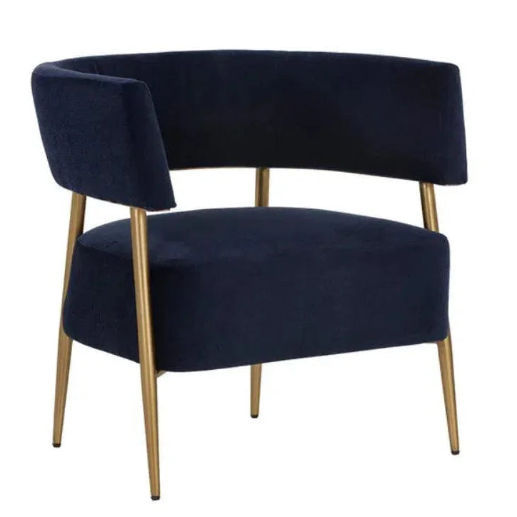 Turn heads with this contemporary lounge chair that exudes extravagance. Featuring a stylish curved frame, this chair is upholstered in a range of luxurious fabrics including Danny Navy and Rust, Danny Rust and Navy, or Dove Cream. It is completed with elegant antique brass legs that enhance its sophisticated design. The chair's versatile color options allow you to choose the perfect match for your space, and it stands out with its unique blend of modern aesthetics and classic detailing.