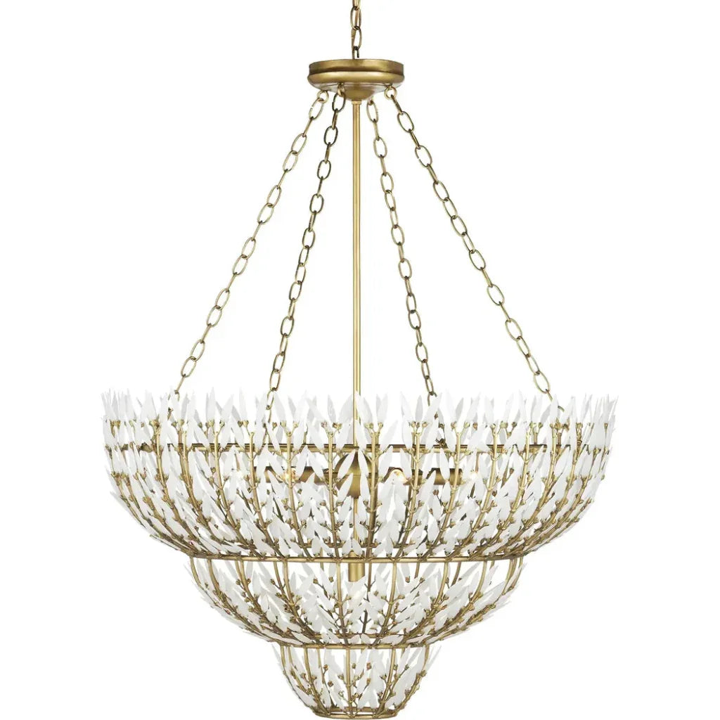 Its sculptural form, crafted with rows of glass leaves delicately attached to the three-tier metal structure, transforms into a dazzling display when illuminated. The contrast between the brass finish and white glass adds further depth and texture to the design, creating a truly enchanting statement piece. Emanating a soft, inviting glow from its seven bulbs, this chandelier serves as a radiant masterpiece and a true testament to Caldwell's ingenuity.