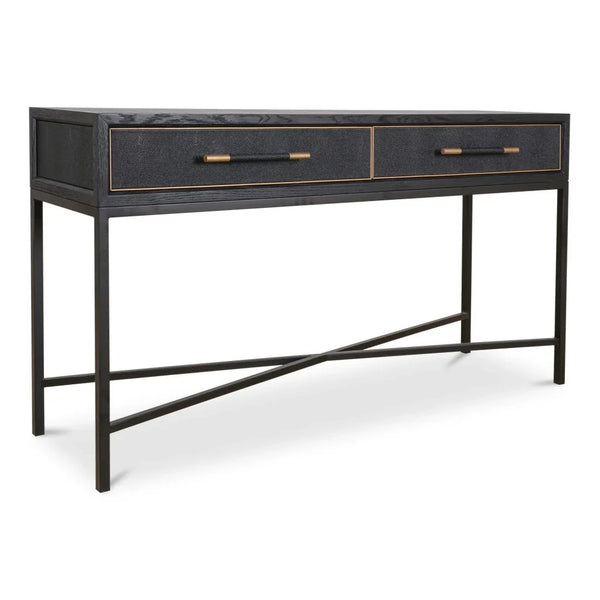 When you want your entryway or living room to make a sophisticated first impression without eating up precious floor space, you need a console table that delivers both style and storage in a narrow footprint. The Moe's Home Mako Console Table is a 59-inch industrial console table with two drawers built for modern homes where space is at a premium, available at LOOMLAN with free shipping to the continental US. This rich black solid oak piece combines the warmth of natural wood with the sleek sophistication of brass-finished iron legs, creating a striking contrast that works equally well behind a sofa or in a narrow hallway. At just 15.75 inches deep, it's designed for those tight spaces where every inch counts, while the two enclosed drawers keep everyday essentials hidden from view. The matt lacquer finish protects the solid oak construction while showcasing the wood's natural grain, and those brass handles aren't just decorative -- they're positioned for easy access whether you're grabbing keys on your way out or storing mail and charging cables.