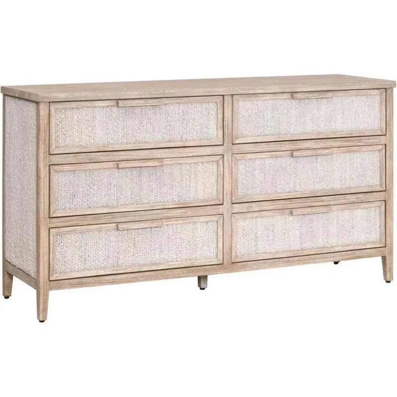 Transform your bedroom aesthetic with our Malay 6-Drawer Double Dresser. Meticulously crafted with a white wash finish and natural gray mahogany frame, this piece radiates opulence. The distinct abaca rope accents provide an artistic flair that appeals to your refined sensibilities. Keep your belongings impeccably organized in the six generous drawers. Malay 6-Drawer Double Dresser - White Wash Abaca Rope Natural Gray Mahogany. Inspired by the coastal elegance with a touch of tropical charm, this dresser will elevate your bedroom to new heights. Skillfully designed with a white wash finish and natural gray mahogany frame, this piece exudes luxurious sophistication. Its unique abaca rope details add an artistic touch that speaks to your impeccable taste.