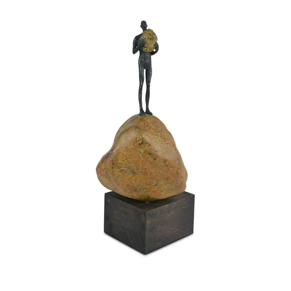 The Man on a Rock Bronze Sculptures is captivating piece that beautifully embody the theme of solitude and introspection. This sculptures is expertly crafted using the lost-wax process, resulting in intricate details and a forged finish that highlights the earthy tones of bronze, brown, and green. The medium version stands tall at 18.25 inches with a metallic figure holding a yellow textured object atop an irregular orange-brown rock, supported by a square black base. Features a contemplative bronze figure on a rock-like base enhanced by a dark wooden stand. These sculptures blend rustic charm with contemporary elegance, making them perfect for modern interiors. Whether displayed in a living room, office, or study, they serve as thought-provoking art pieces and conversation starters. Their artisanal craftsmanship and profound themes make them ideal additions to any art collection, evoking admiration and deep reflection.