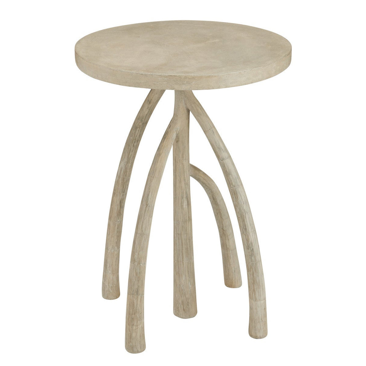 The Mangal Accent Table is a faux bois design made of concrete in a Portland finish; its form inspired by the curving shapes of mangrove roots. Suitable for outdoor use, the table features a slightly shorter middle leg that ensures it always sits level. The sculpted legs show detailed texture work, enhancing the naturalistic character of the piece.