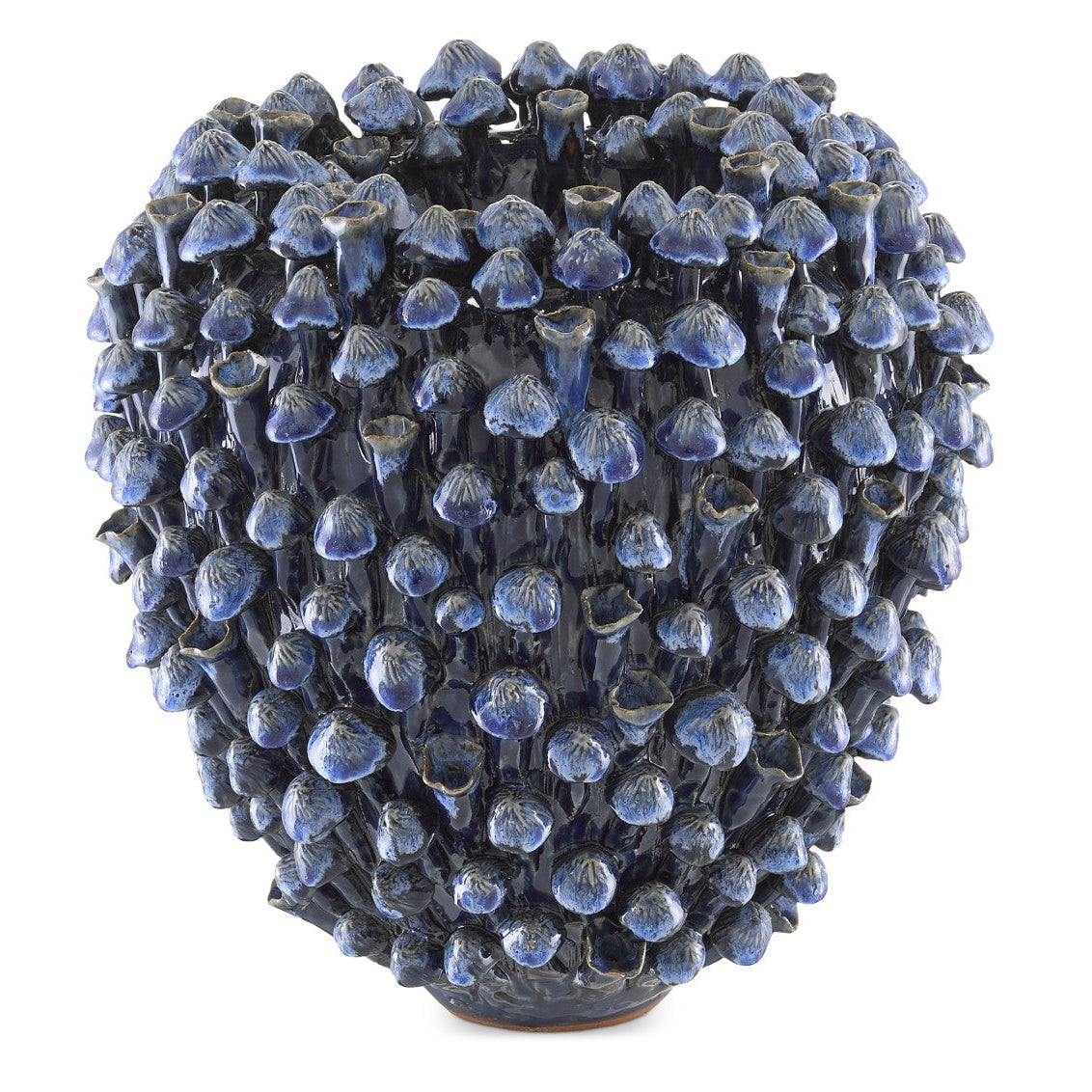 Our Manitapi Medium Blue Vase is made by a group of women who live at the border of Burma and Thailand. Made from black terracotta, this incredible hand-thrown, dark blue vase is completely covered in handmade bell-shaped flowers. Once the blossoms are in place, the vase is glazed with a rich deep blue.