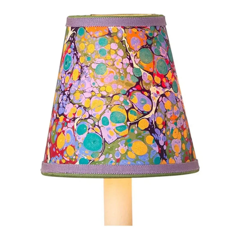 Petite shades are an easy way to bring added style to a space while also introducing color and texture, particularly when they are made from artisanal marbleized paper and ornamented with two layers of grosgrain ribbon. The Marble Multi-Color Paper Tapered Chandelier Shade has a bold pattern in multi-colored hues that was achieved by a New England atelier. Patterns will vary slightly due to the nature of the marbleizing process.