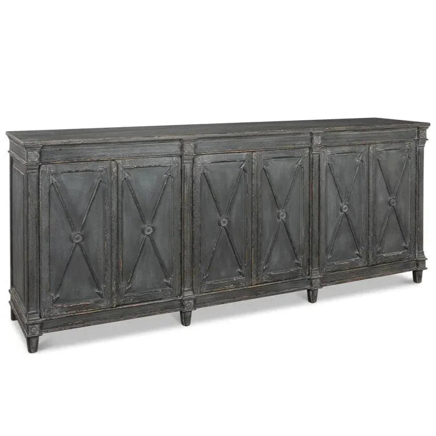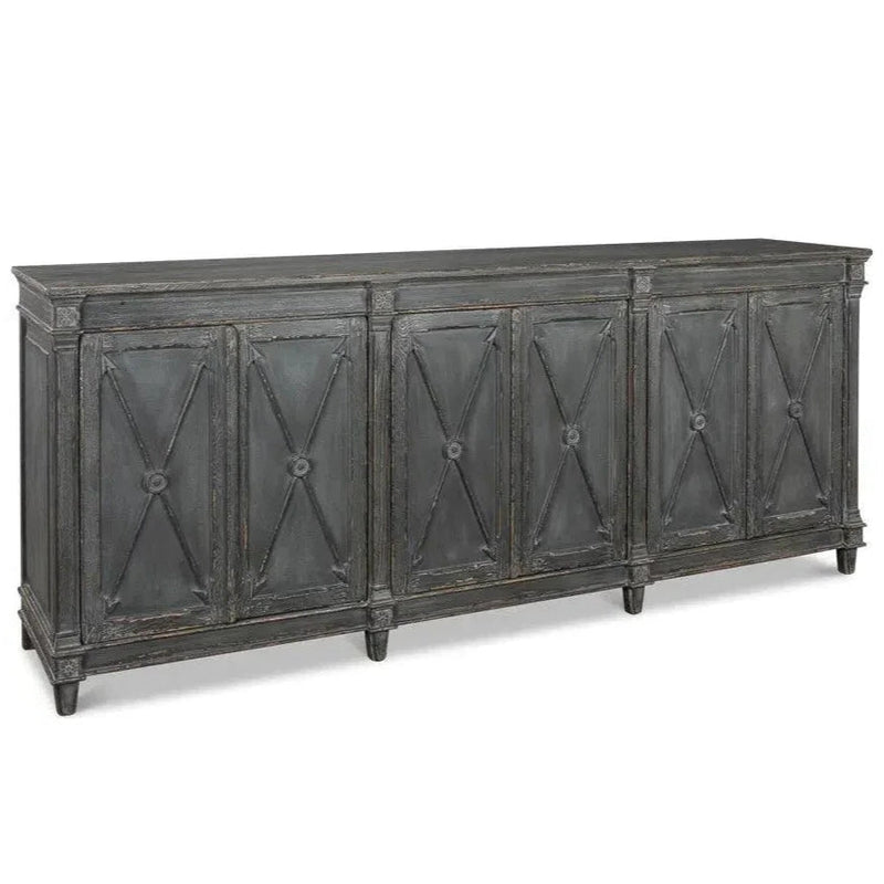 Discover the distinguished gentleman of your dining room with the Marksman Sideboard. Handcrafted from solid Reclaimed Pine, this 96-inch wide sideboard offers ample storage space for your finest dinnerware and barware. Finished in a handsome charcoal grey with refined iron hardware, it's built to last for generations. Add sophistication and timeless style to your home with the Marksman Sideboard.