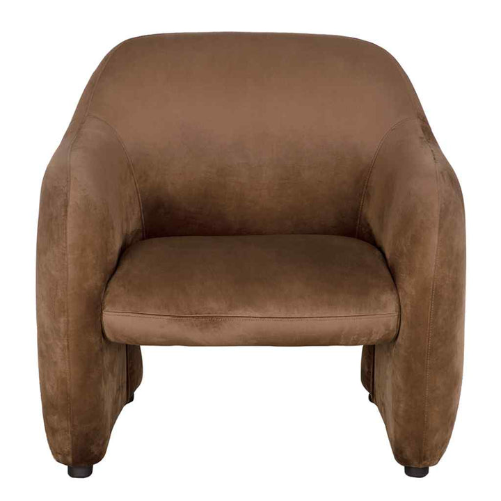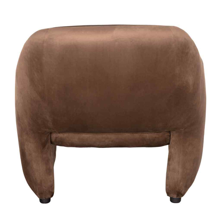 Experience comfort and style with this modern armchair. Its soft, rounded design offers a cozy feel, while the plush brown velvet upholstery adds a touch of elegance. The continuous curves and minimalistic feet create a unique look that fits well in any room. This chair is designed with arms, providing additional relaxation for your seating experience. Its rich brown color blends seamlessly with various decor styles, making it a versatile piece. The low profile ensures it is perfect for cozy corners or open spaces, combining comfort and contemporary charm effortlessly.