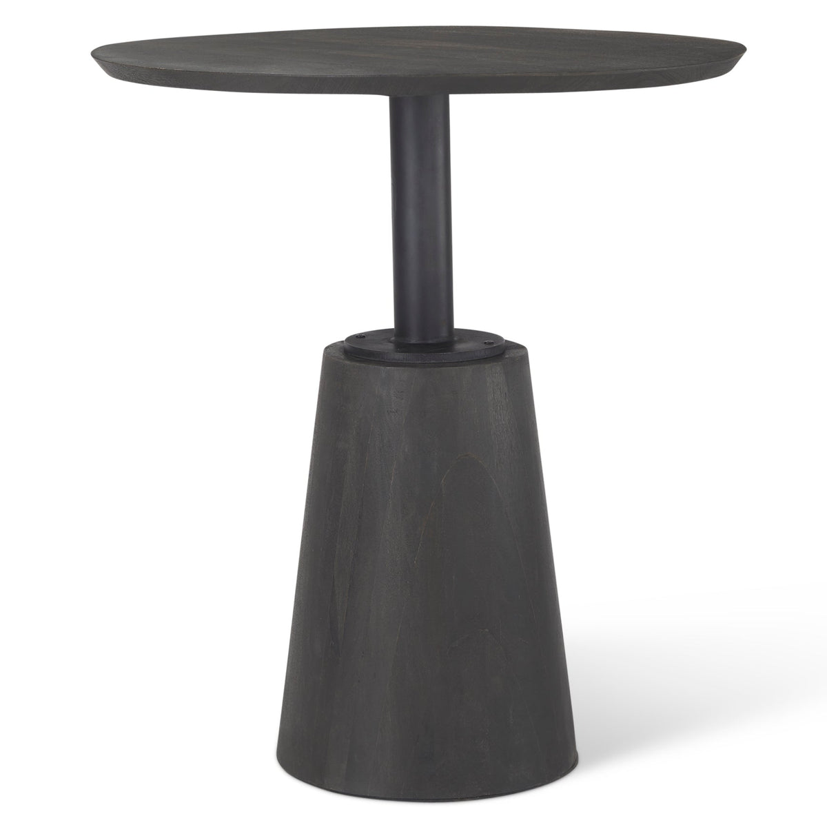 - This Maxwell simple, round tabletop made from solid Mango wood sits upon an iron pedestal anchored by a tapered wooden base. The smooth, black-natural finish of the wood tabletop and base complements the iron.