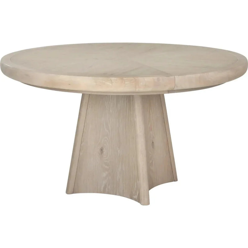 Experience the elegant design and practicality of the Melia Round Dining Table. Featuring a sleek waterfall veneer layout and smooth edges, this table embodies a sense of fluidity and grace. The light sand finishes with wire brushing accents and custom hardware highlight the impeccable craftsmanship of this piece. With a unique pedestal base and the ability to extend from 54" to 72", the Melia table is the ideal blend of style and functionality.