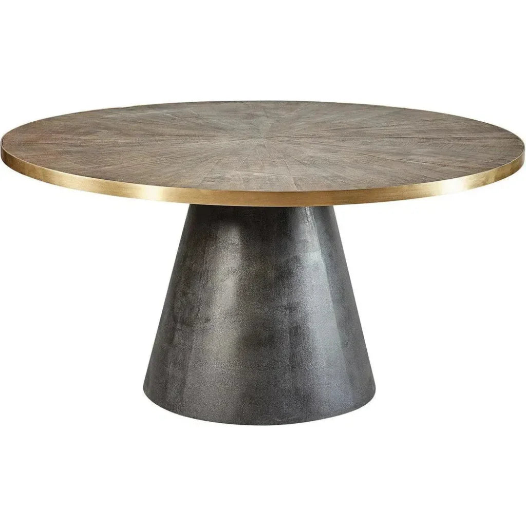 Big enough to host your friends, and with enough style to carry the room, this handsome table features a sunburst reclaimed pine top with a warm burnished brown finish. A collar of champagne metal enhances the simple geometry of the top, which rests upon a truncated cone of black-finished resin. Take entertaining to the next level! With a spacious top that makes any dinner party a hit and a sleek, striking design that commands attention, this dining table creates a bold vibe in any space!