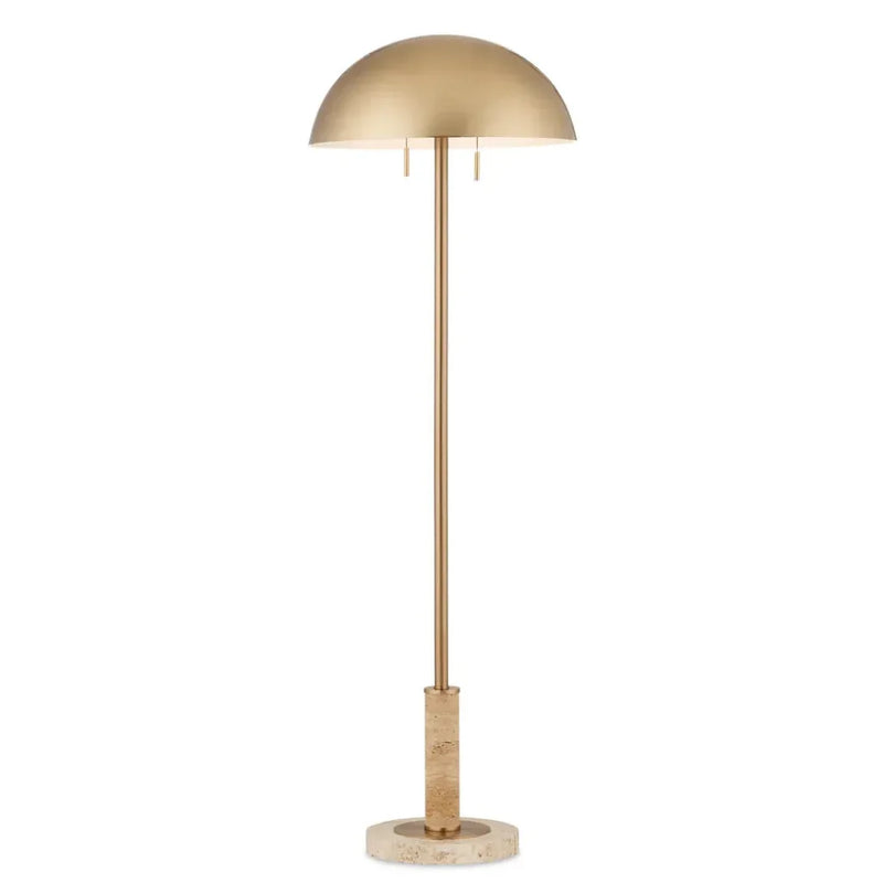 Add a refined and sophisticated touch to your home with this beige lamp, expertly curated to bring out the natural beauty of the travertine base and the richness of the domed brass shade. Experience the exclusivity and luxury of the Miles Floor Lamp, a unique piece that will elevate your living space.