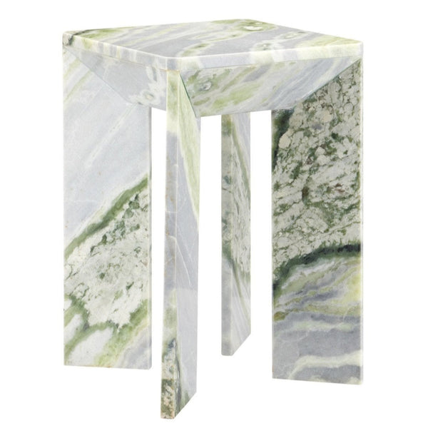 The Minerale Green Onyx Accent Table is a stunning piece that will add elegance to any room. Made from rich green onyx marble, this table showcases a unique pattern of veins in green, gray, and beige, ensuring each piece is one-of-a-kind. The square table has a sleek design with an angular shape and a chamfered top, which gracefully descends into an apron. Its legs reflect this receding design, making it a perfect fit for those who appreciate refined craftsmanship.
