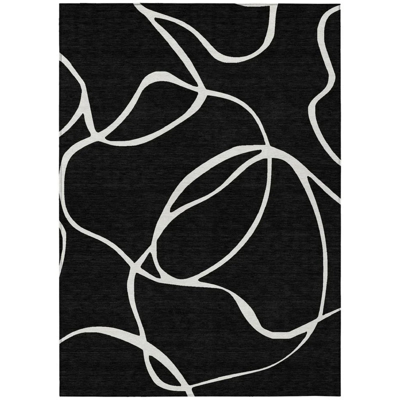 Experience the fluid beauty of the Mirelle Black Washable Rug. This elegant piece showcases random thin ribbon patterns and free-style swirls, adding a touch of sophistication to any room. Designed to effortlessly blend with existing decor, this rug is both stylish and functional. Whether placed in the living room, bedroom, or even your outdoor patio, its versatility is unmatched. The black color provides a neutral base, making it easy to complement various color schemes and styles.