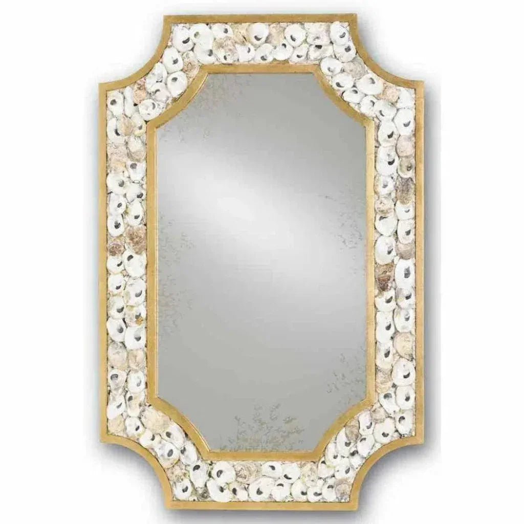 The Margate Rectangular Oyster Shell Mirror has a hand-applied oyster-shell panel on the interior of its scalloped frame, the shells carefully placed there by artisans. These are surrounded on both sides by wrought iron trim in a contemporary gold leaf finish. The shell mirror can be hung horizontally or vertically.
