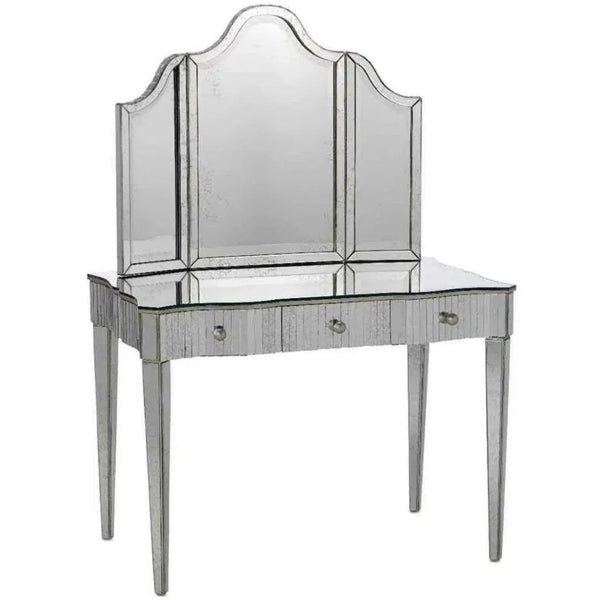 The Gilda Silver Vanity Mirror is Hollywood glamour personified with its mirror-on-mirror composition. The fluted shape of its top is a distinctive feature. Pair it with the Gilda vanity table to add to its air of sophistication. It comes with a metal cleat for hanging and a safety bracket for mounting it to the vanity.