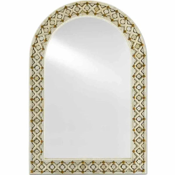 Texture and depth bring our Ellaria Rectangular Mirror, which was inspired by traditional Indian design, a powerful punch. Hand-made of bone arranged in crosshatches that are inset with floral motifs, the arched tan decorative mirror has an exotic appeal with its brass details.