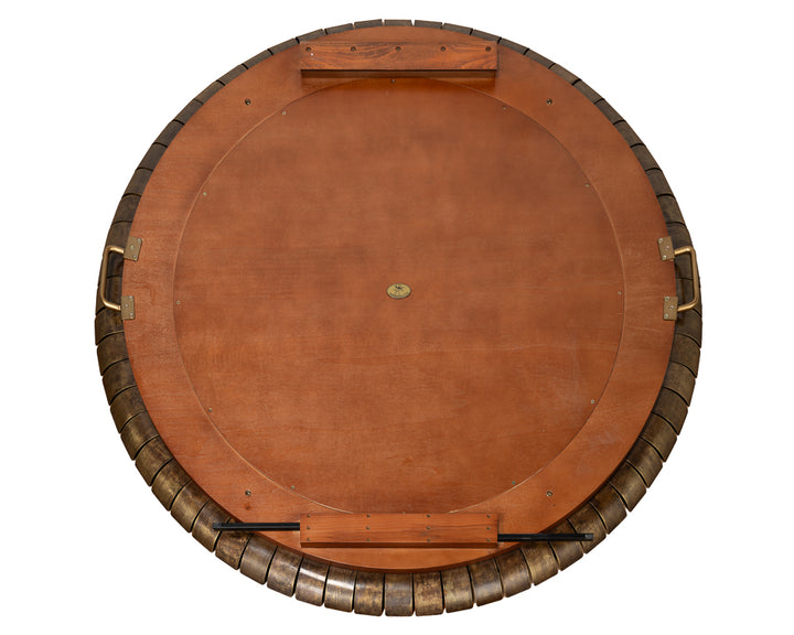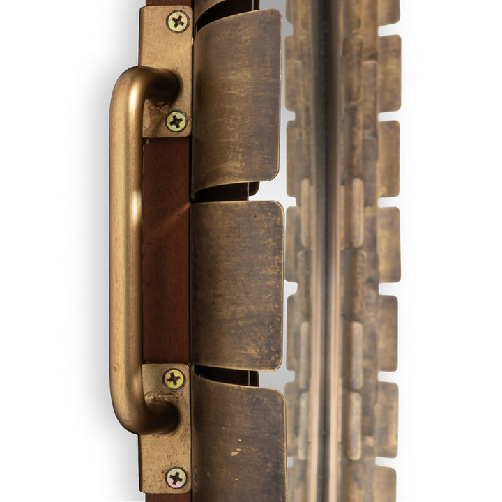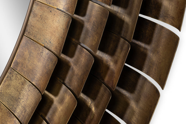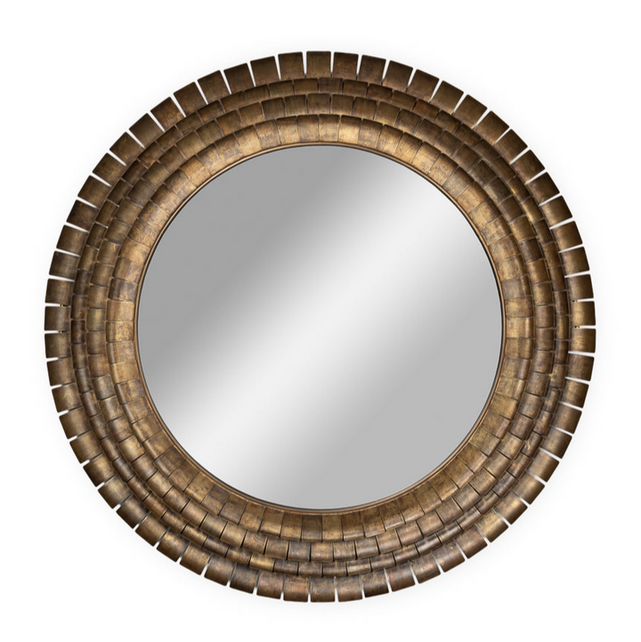 Bring elegance and style to any room with this stunning wall mirror. Crafted from brass plate with a rich gold finish, it features a unique layered frame design. The textured concentric circles add depth and sophistication, making it a great focal point for contemporary spaces. Its round shape and large size create an eye-catching element on any wall, while the antiqued gold finish complements a variety of color schemes. Perfect for living rooms, bedrooms, or entryways, this mirror effortlessly combines functionality and design, reflecting light to brighten up spaces and give the illusion of more room.
