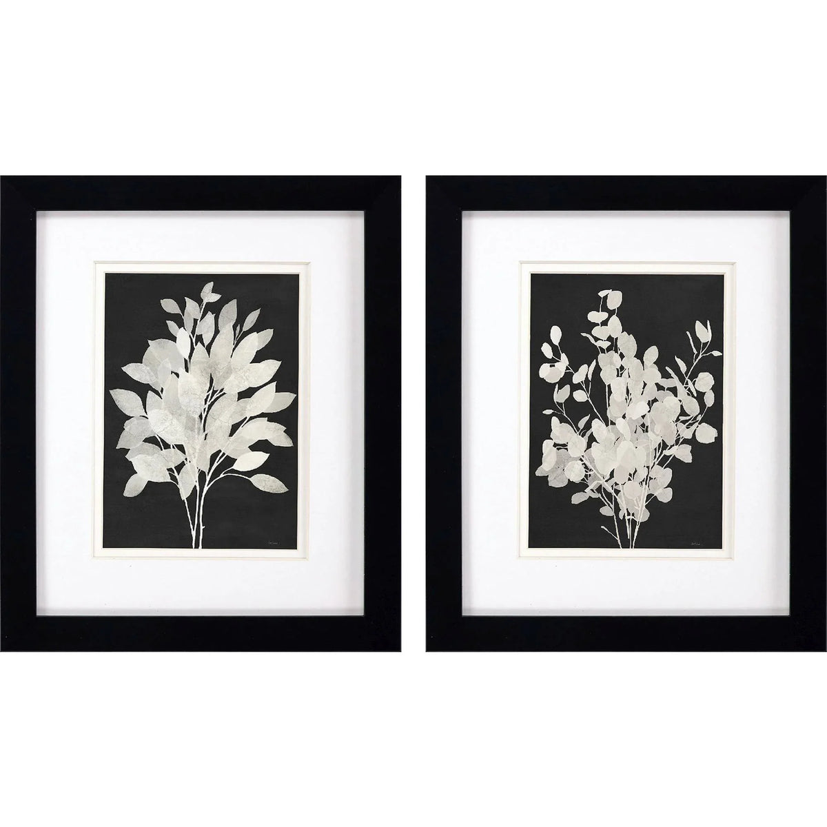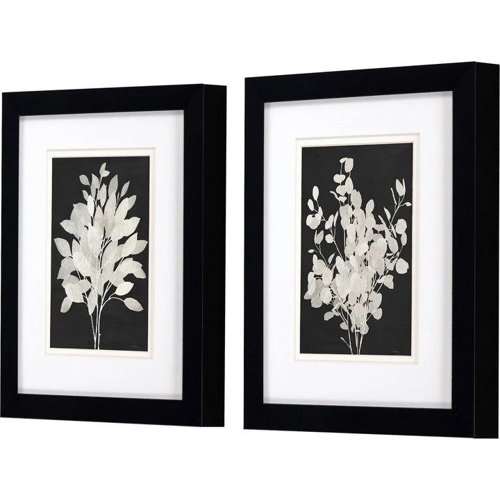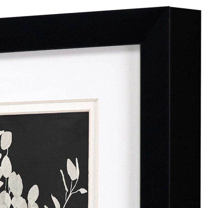 Enhance your living space with a touch of elegance through these Framed Wall Art pieces. The Misty Branches S/2 Framed Wall Art With Glass Front features a striking black and white color scheme that fits effortlessly into any decor style. Each piece showcases leaf silhouettes, beautifully double matted in white, creating a captivating contrast against a black background. The minimalist design is framed in a modern flat moulding with a sleek black finish, adding a touch of sophistication to your walls.