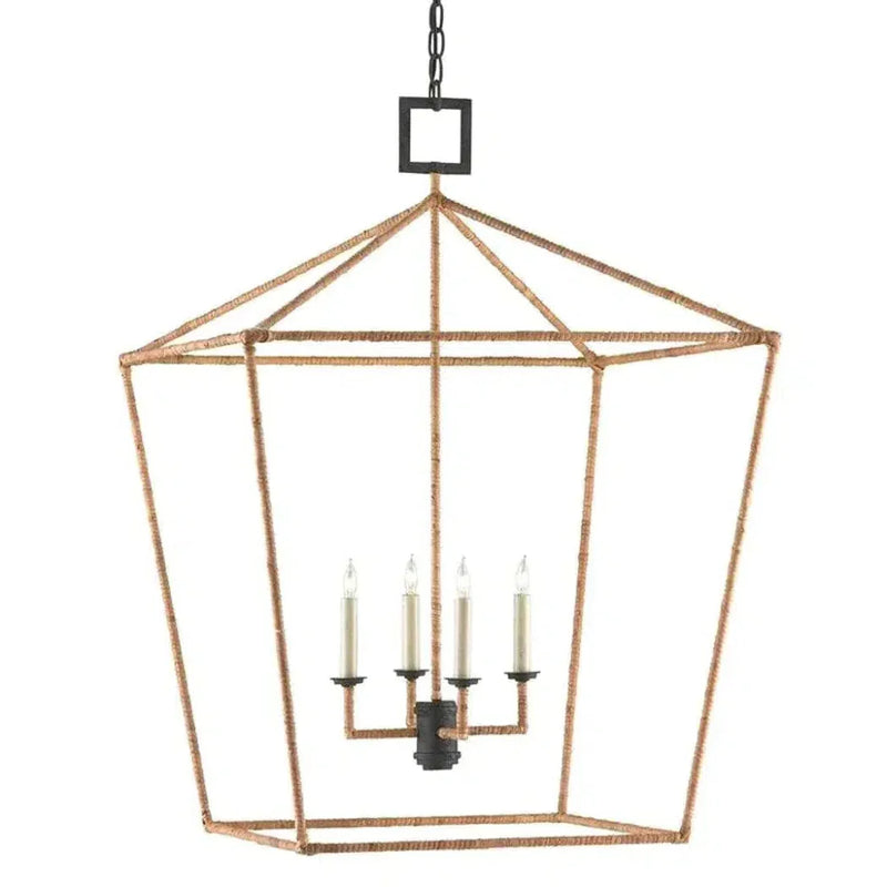 The Denison Grande Natural Lantern is a hammered wrought-iron fixture in a Mole black finish that is wrapped in rattan. The classic lantern shape has stood the test of time to make it one of our most popular offerings. A design element of note is the square that fastens the lantern to the chain. Adjustable from 53.5" to 122.5" with use of included chain/rod kit/cable. If your space calls for a longer drop, additional chain/rods/cable is available for purchase.