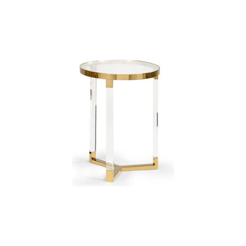 The Moravian Side Table brings a touch of elegance to any room with its sleek and modern design. This round side table features a clear tempered glass top that enhances its refined appearance. The polished brass finish on the iron edging adds a luxurious feel, making it a standout piece in both contemporary and traditional settings. Its transparent acrylic legs provide a sturdy base while maintaining a light and airy look, perfect for small spaces or as a complementary piece in a larger room. This side table is not only stylish but also functional. It's ideal for placing next to a sofa or chair, providing a convenient spot for beverages, books, or decorative items.