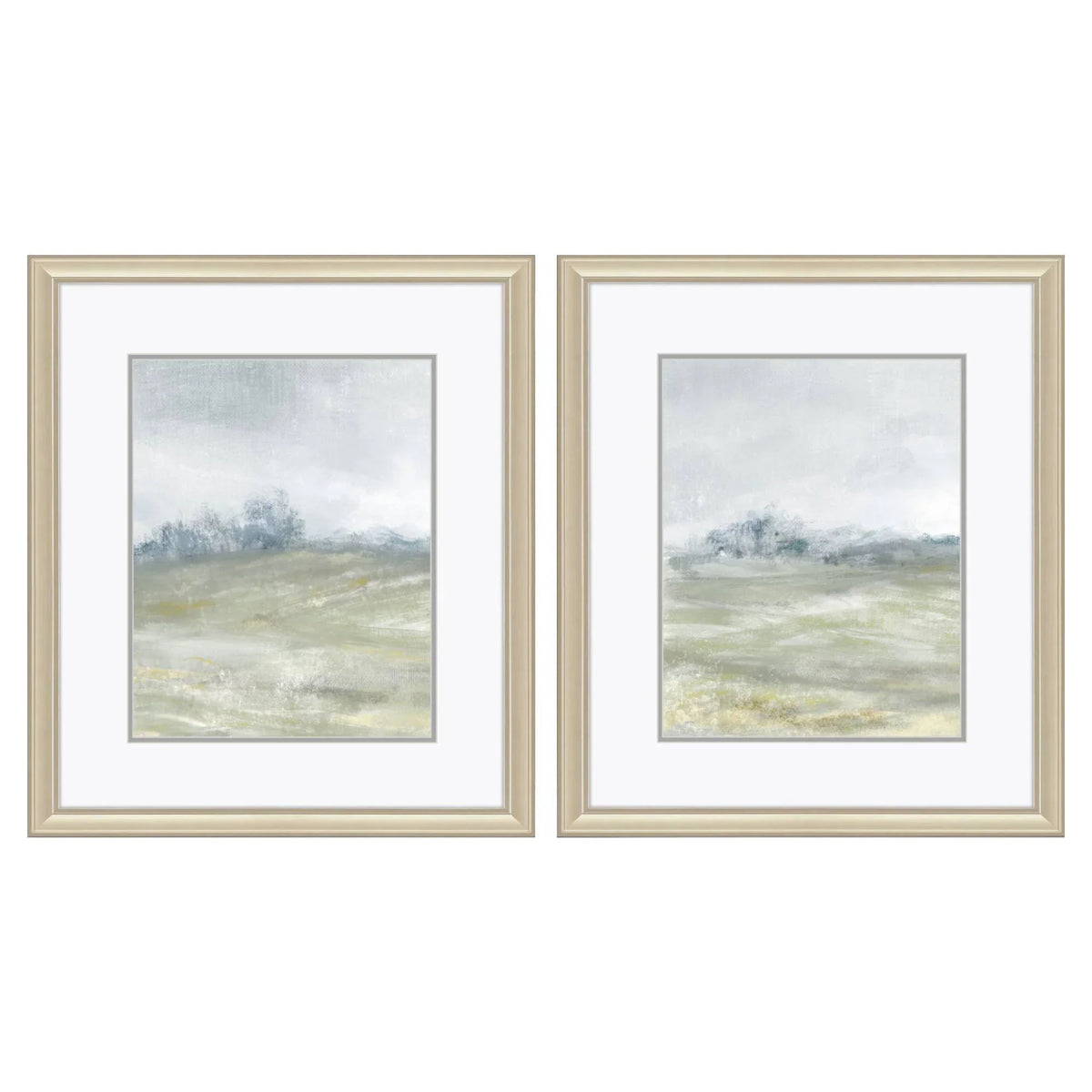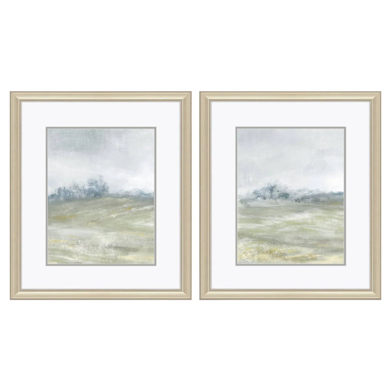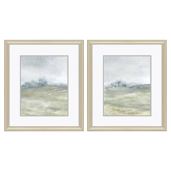 Transform your living space with the Morning Mist S/2 Framed Wall Art Set. This elegant set features two serene landscape images that bring a touch of calm to any room. The art pieces are accentuated with double matting and framed under glass, ensuring a refined look. The antique silver frames add a classic touch that complements the soft neutral colors of the artwork, including beige, gray, white, and hints of blue. This set is perfect for creating a peaceful atmosphere in your home, whether it is displayed in a living room, bedroom, or hallway.
