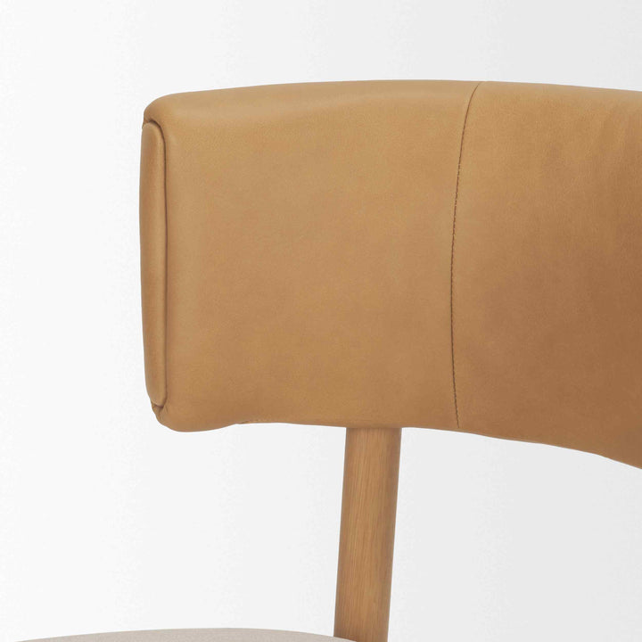 The Motley Dining Chair blends shape, material, and tone to offer a unique look. With a tan leather wrapped backrest and a cream fabric seat, this chair adds elegance to any dining space. The solid rubberwood frame features a warm, natural finish that ensures durability. Its open and curved silhouette not only looks good but also provides comfort, making it a perfect addition to your home. This chair's modern design with a touch of architectural edge makes it a standout piece. No need to worry about setup, as it comes ready to use right out of the box.