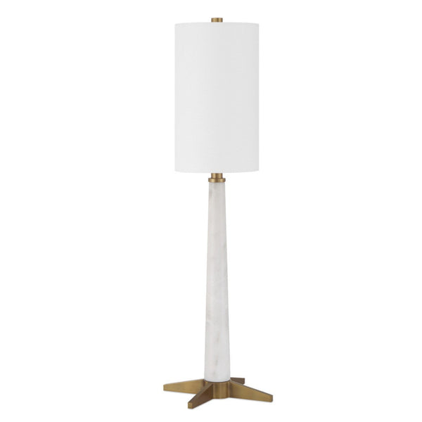 The Munroe White Table Lamp brings the sleek style of the 1920s and 1930s Art Deco era into modern homes. Its elegant design features a telescoping body made from beautiful white marble with gentle gray veining, giving it a sophisticated look. The base has an X-style design in an antique brass finish, adding a touch of class and stability. This lamp's slender shape makes it ideal for spaces where you want a stylish yet unobtrusive lighting solution.