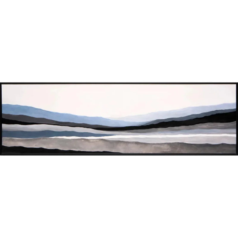 Layers of cool blue, grey, and black tones in this painting evoke a sense of exploring a mountainous terrain. This piece of art features a wavy horizontal shape and canvas texture that brings a unique visual appeal to any room. The mixture of colors and tones creates a calm and serene atmosphere, making it a perfect addition to any modern home decor.