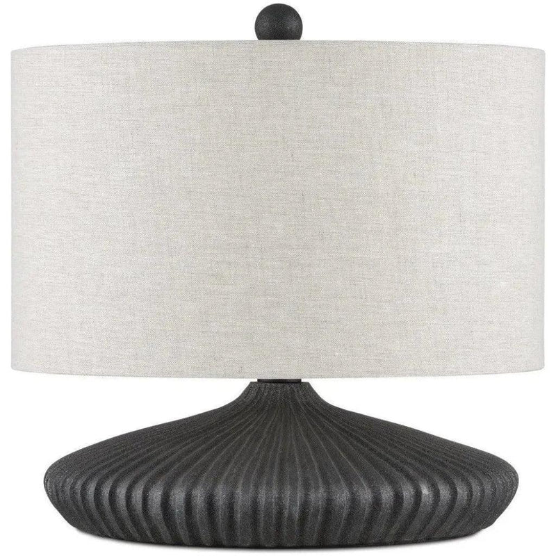 The Mythmaker Table Lamp lives up to its name, as its squashed circular body is made of terracotta in a mix of satin black and black granite finishes that make it look as if it has been forged of iron. Though there is a slight aged feel that brings the lamp added texture, it is still modern in its lines. The oversized shade paired with the flatness of the body is a stylish design detail, as is the matching finial that fastens the shade to the lamp.