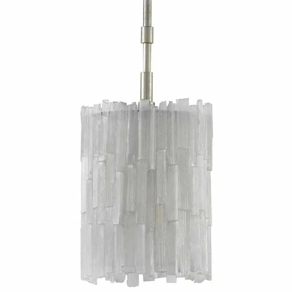 Our Moonstone Pendant in the Aviva Stanoff Collection has a shade of Selenite crystals dangling from a frame in a chinois silver leaf finish. This silver and crystal pendant quietly glows whether the lights are switched on or not. Adjustable from 16.25" to 55.25" with use of included chain/rod kit/cable. If your space calls for a longer drop, additional chain/rods/cable is available for purchase.
