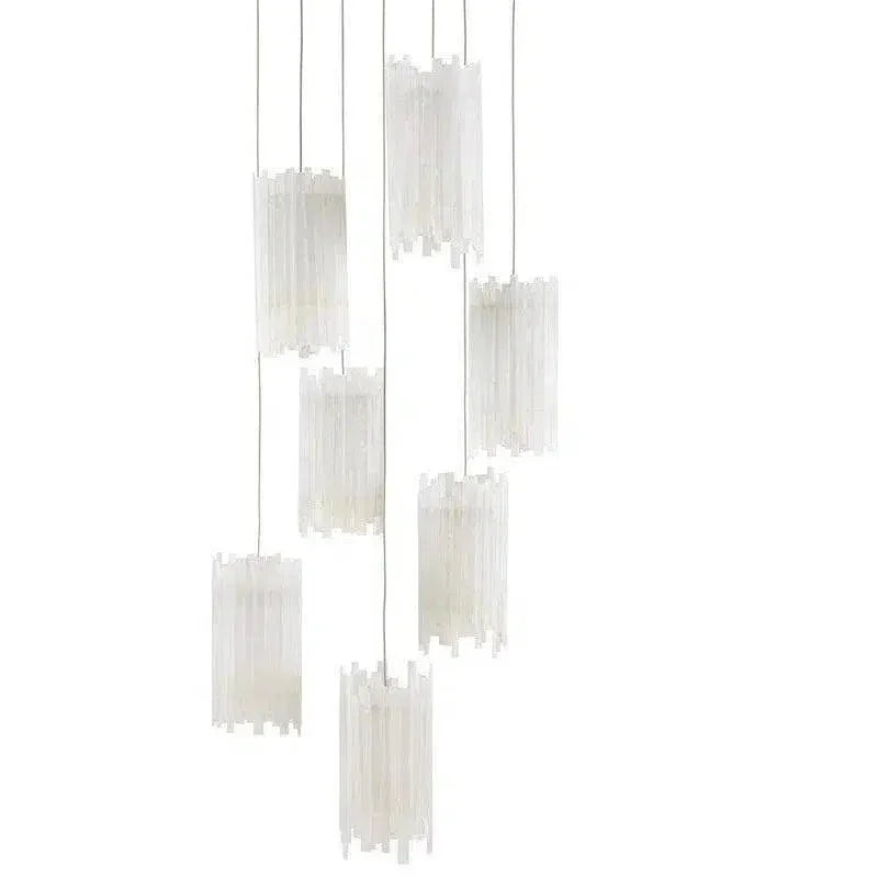 The Escenia 7-Light Multi-Drop Pendant has shades made of natural selenite. The ribs of the essential natural material are staggered top and bottom, which brings the shape of the shades added interest. When the lights are switched on, a beautiful glow is created by the crystal bars. The canopy of this piece is luminous in a painted silver finish. This fixture is among Currey & Company's multi-drop pendant collection, which includes multiple configurations.